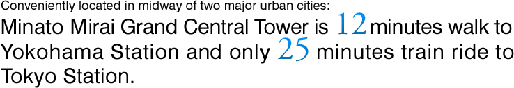 A two-minute trade ride takes you from the nearest Minatomirai Station to Yokohama Station. This huge hub station, with 11 different lines available, is 12minutes walk via the Hamamirai Walk. The transport network provides convenient access to major areas in the Tokyo metropolitan region, ensuring maximum business efficiency. The Shinkansen (bullet train) can be accessed from Shin Yokohama Station, which is about 11 minutes away by subway. The increasingly international Haneda Airport is reached in about 20 minutes by car. Minatomirai Grand Central Tower is well placed for travel to domestic and overseas destinations.